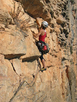 L5: Aquest li tocava a la Cris, però donat que anàvem més que petades, que era un 6b+ , que no s'hi veien masses espits i que jo, ahir, li havia dit a la Cris que no patís, que ja tiraria jo si calia... brrr... per què coi li havia dit? Je, je!!! Doncs li he tirat jo!! I hem liat una amb les cordes... ens hem hagut de desencordar una i després l'altra... semblava que cada vegada la liéssim més... je, je... no sé quanta estona hem estat en aquesta reunió, però el sol començava a baixar... i sols pensar en tot el que m'havien dit de l'últim llarg... glups!! Se'm posava la pila de cop!! I aquest ja havíem quedat que el faria jo... Així que sense pensar-s'ho i cap a munt!! I quin llarg... llàstima que ja no estava per fotografies... per què era d'alló més aèri... amb un primer fort desplom que finalment es convertia en verical però que no et deixava parar ni a respirar!!